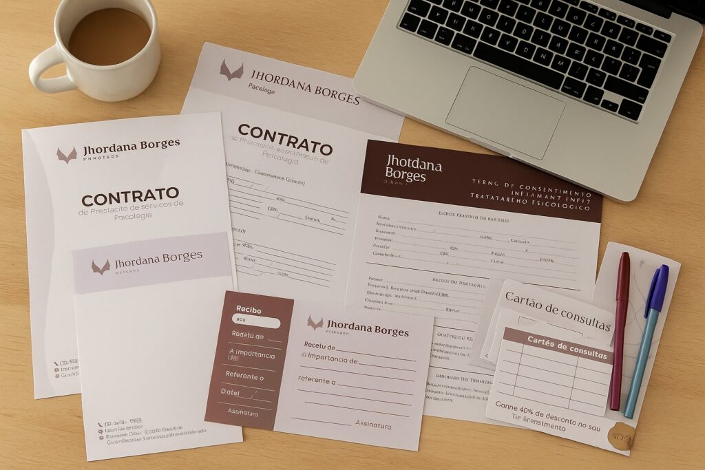 Contratos, termos, recibos, papel timbrado, cartões e sinalizações prontas para uso.