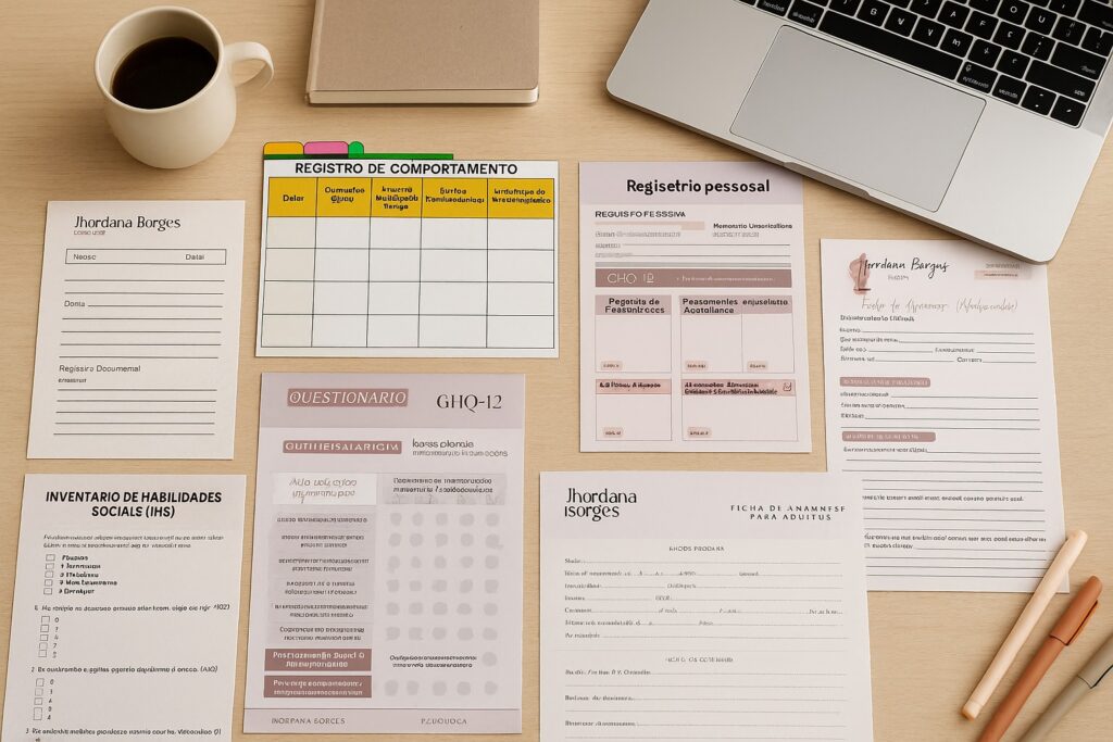 Modelos completos de anamnese, escalas, fichas de acompanhamento e questionários práticos.